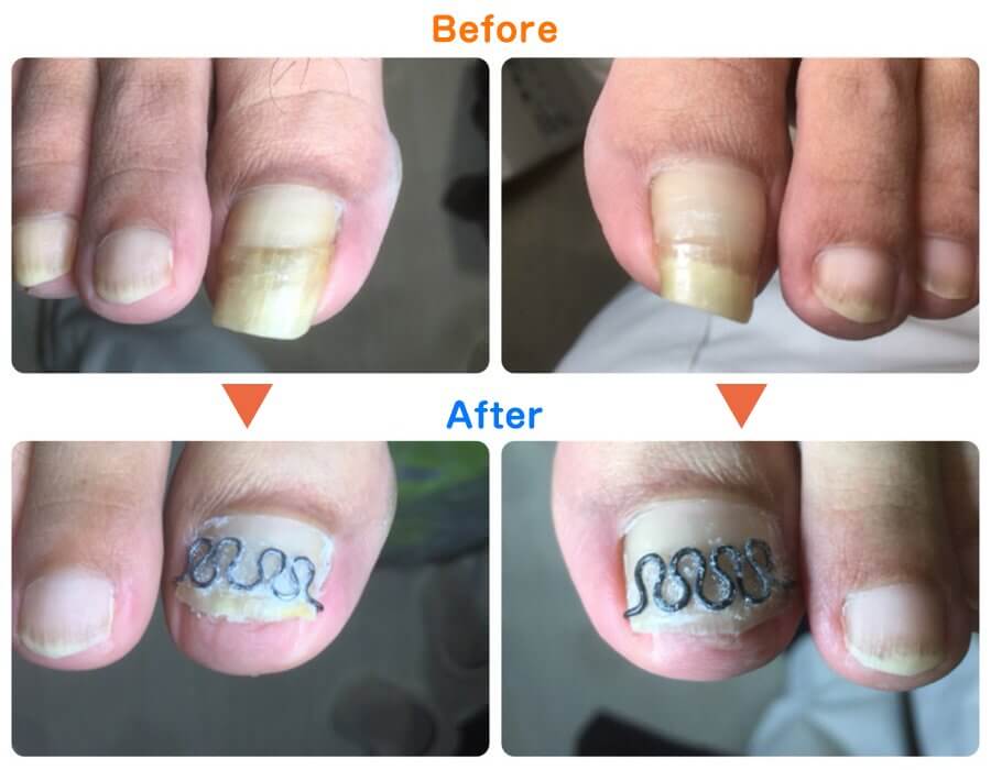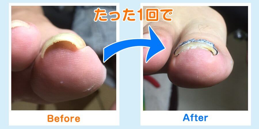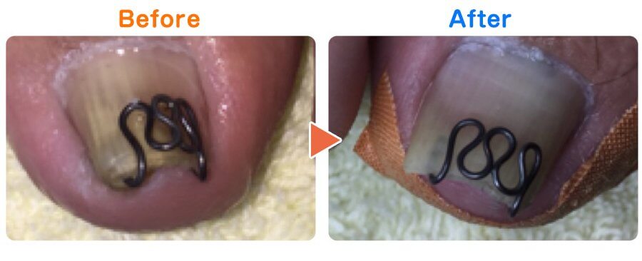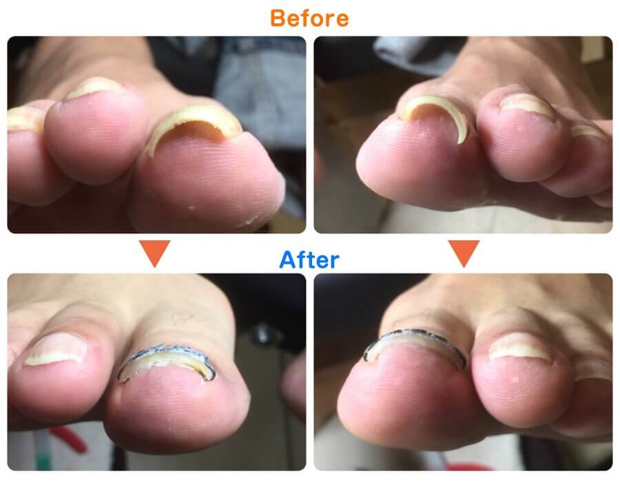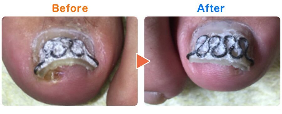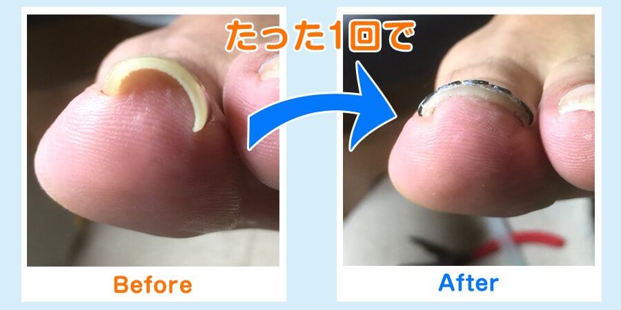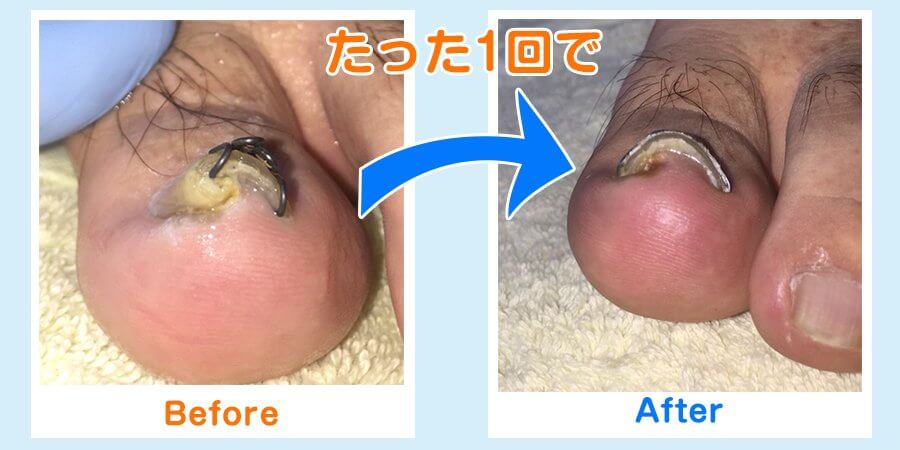 「巻き爪矯正ツメフラ法」のビフォーアフターをご覧ください。